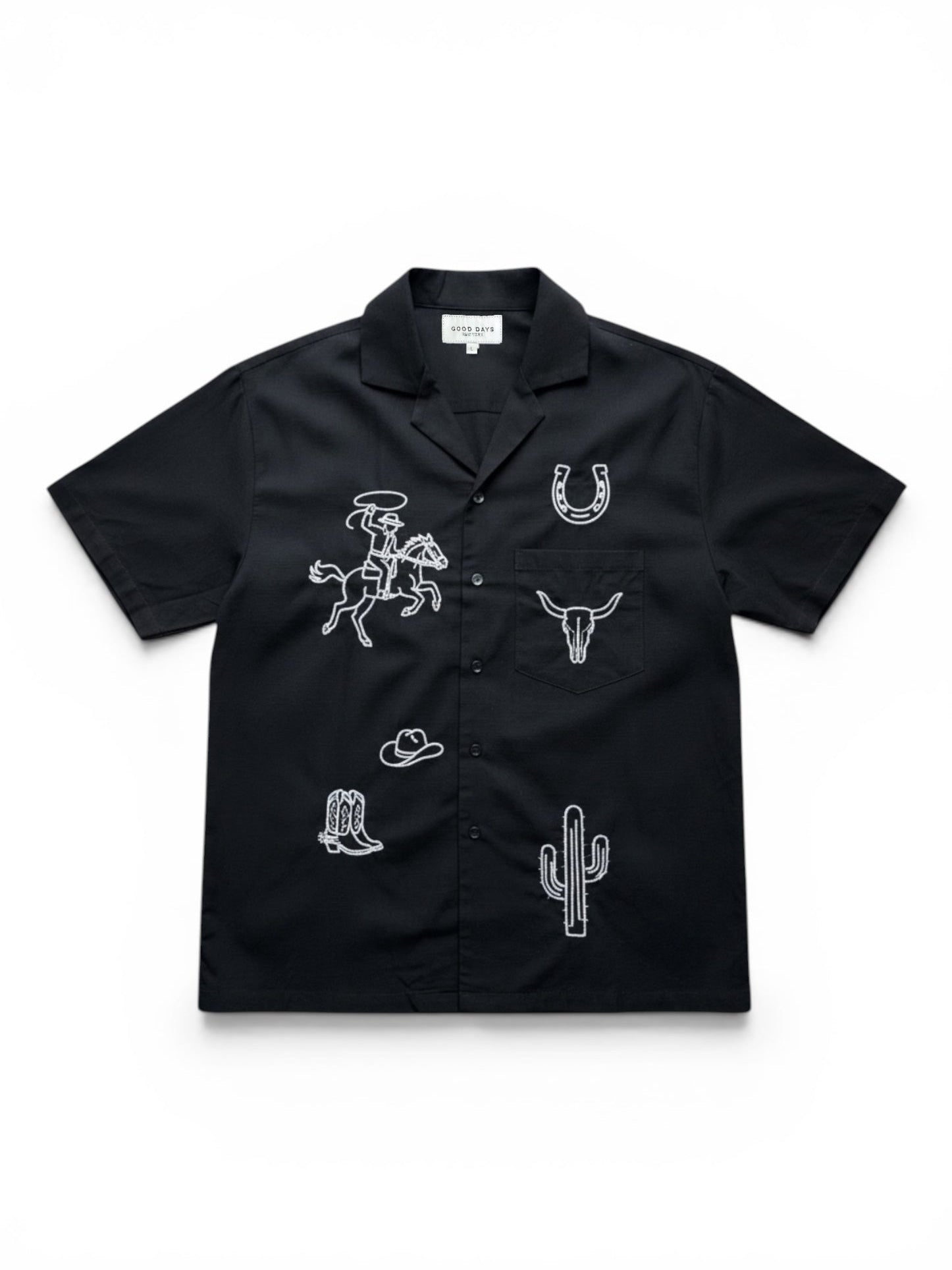 A modern take on classic western style. Our Somewhere Out West Camp Shirt features chain-stitched embroidery of cowboy icons including a rider on horseback, longhorn skull, cactus, boots, horseshoe, and hat. Cut in a relaxed camp collar silhouette on a deep black base, it blends vintage rodeo inspiration with everyday wearability. A small snake embroidered on the back gives the piece some extra bite.